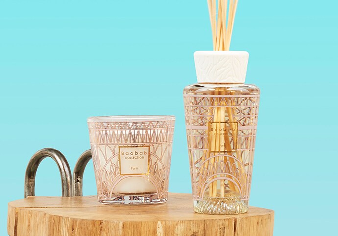 Świeca zapachowa Paris i dyfuzor zapachowy zdobione są sitodrukiem w kolorze pudrowego różu i złota przedstawiającym stylizowaną konstrukcję wieży Eiffla. Świętujemy urokliwy miesiąc maj w Paryżu, wspomnienia kwitnących kasztanowców i lipy. Ten zapach z mieszanką limonki i tulipana przeniesie Cię do romantycznego miasta.