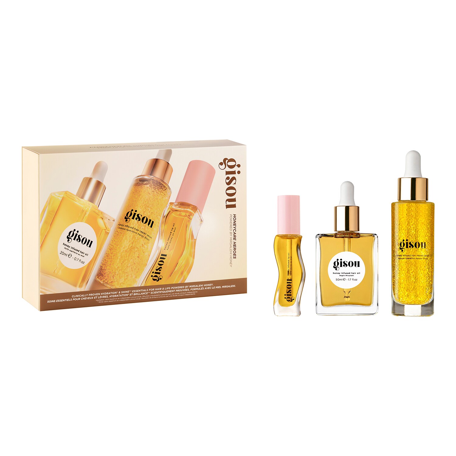 Nasz kultowy i wielokrotnie nagradzany olejek do włosów Honey Infused Hair Oil nadaje połysk i wygładza puszące się włosy. Honey Infused Hair Repair Serum wzmacnia włosy i naprawia rozdwojone końcówki, zatrzymując nawilżenie. A na koniec nasz bestseller – olejek do ust Honey Infused Lip Oil w odcieniu Honey Gold, który intensywnie nawilża i nadaje ustom połysk.
