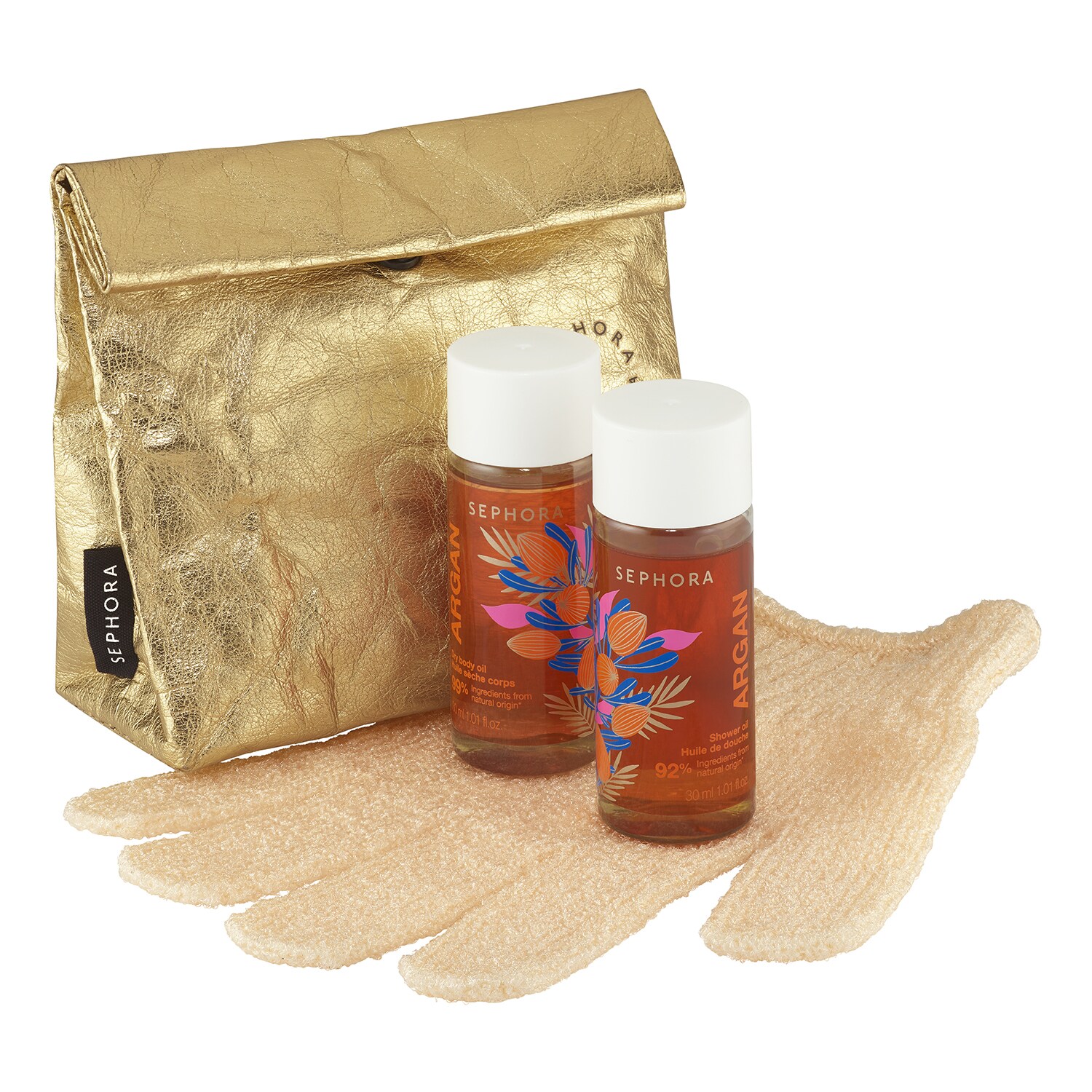 Relaksujące trio: 1 Olejek pod prysznic Argan, 1 rękawica do ciała peelingująca do mycia i delikatnego złuszczania i 1 Suchy olejek Argan odżywiający do ciała.