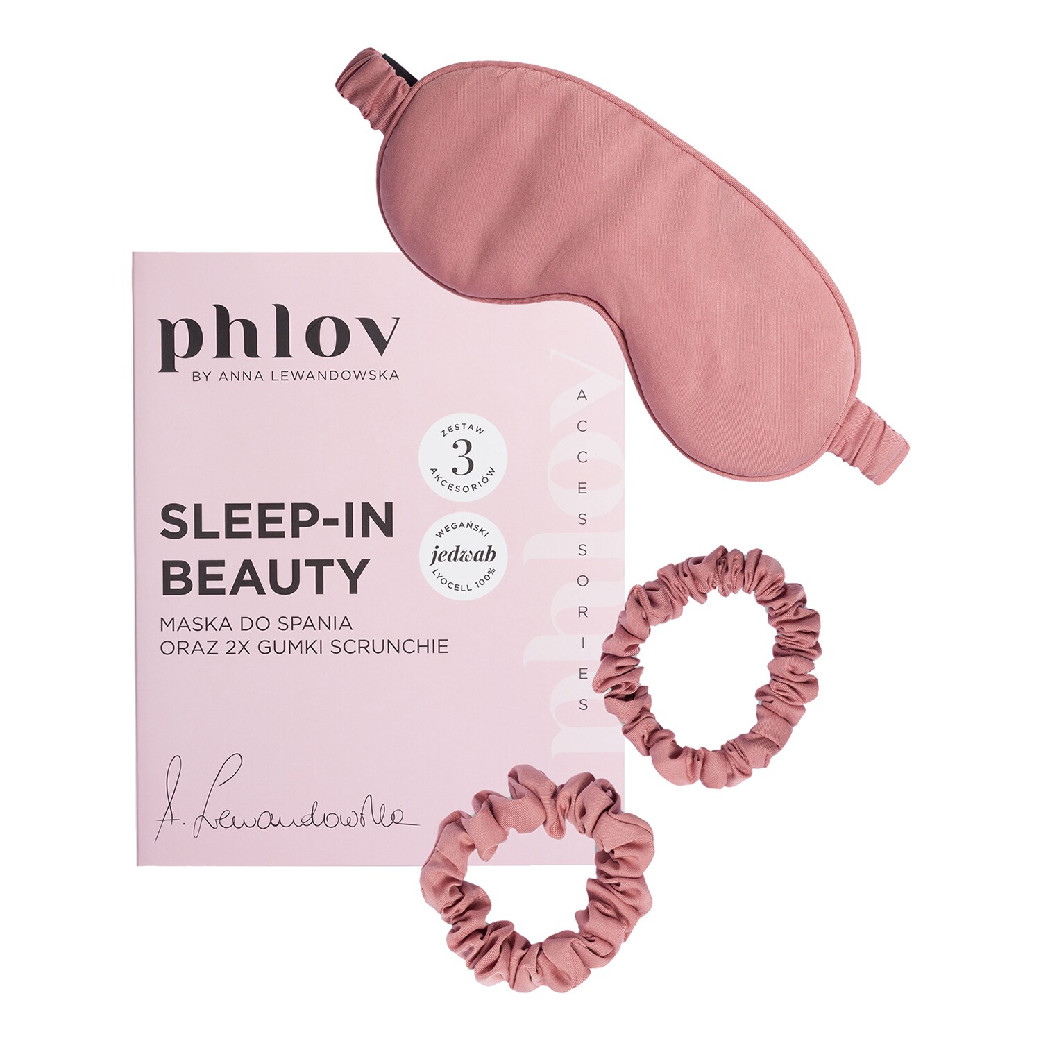 -Mała gumka do włosów (~8 cm) w kolorze pudrowego różuZestaw złożony z maski na oczy i dwóch gumek scrunchie. Całość jest wykonana z innowacyjnego, wegańskiego odpowiednika jedwabiu. Maska na oczy jest wyjątkowo gładka i miękka, dzięki czemu podnosi komfort snu oraz pozytywnie wpływa na skórę wokół oczu, utrzymując jej poprawne nawilżenie i spowalniając proces powstawania zmarszczek. Delikatne scrunchies są łagodne dla włosów, nie łamią ich i zapobiegają elektryzowaniu, dlatego świetnie sprawdzają się do ochrony włosów - także w trakcie snu.